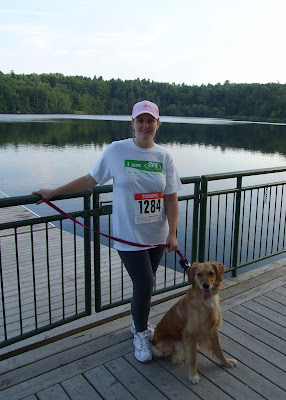 I'd asked about taking Miss Sadie on the walk with us since it was actually her one year anniversary as well. It seemed a little unclear but basically if you kept your dog from messing up everyone else starting then it was ok. We brought her along to the park and she was being a very good girl but David got uncomfortable with the looks he was perceiving from the competitive runners. Now it's my impression that the really competitive runners were largely seeing ALL of us as a pain in the neck rather than little Sades. However, Sadie got left in the dog kennels in the boat house at DayTripping when we set off.